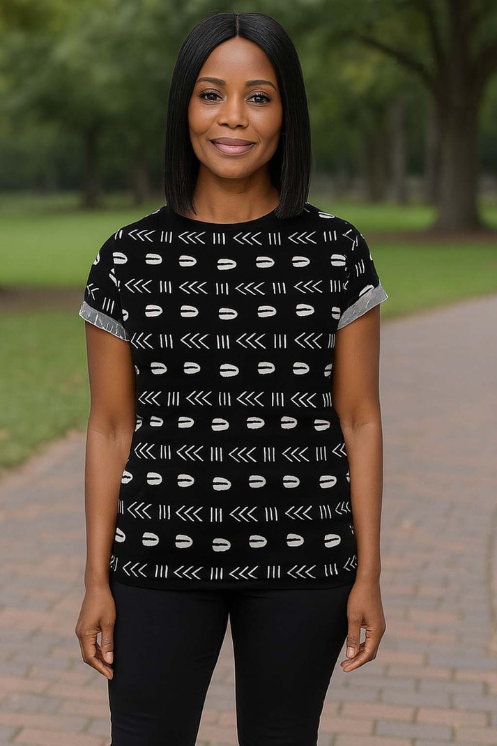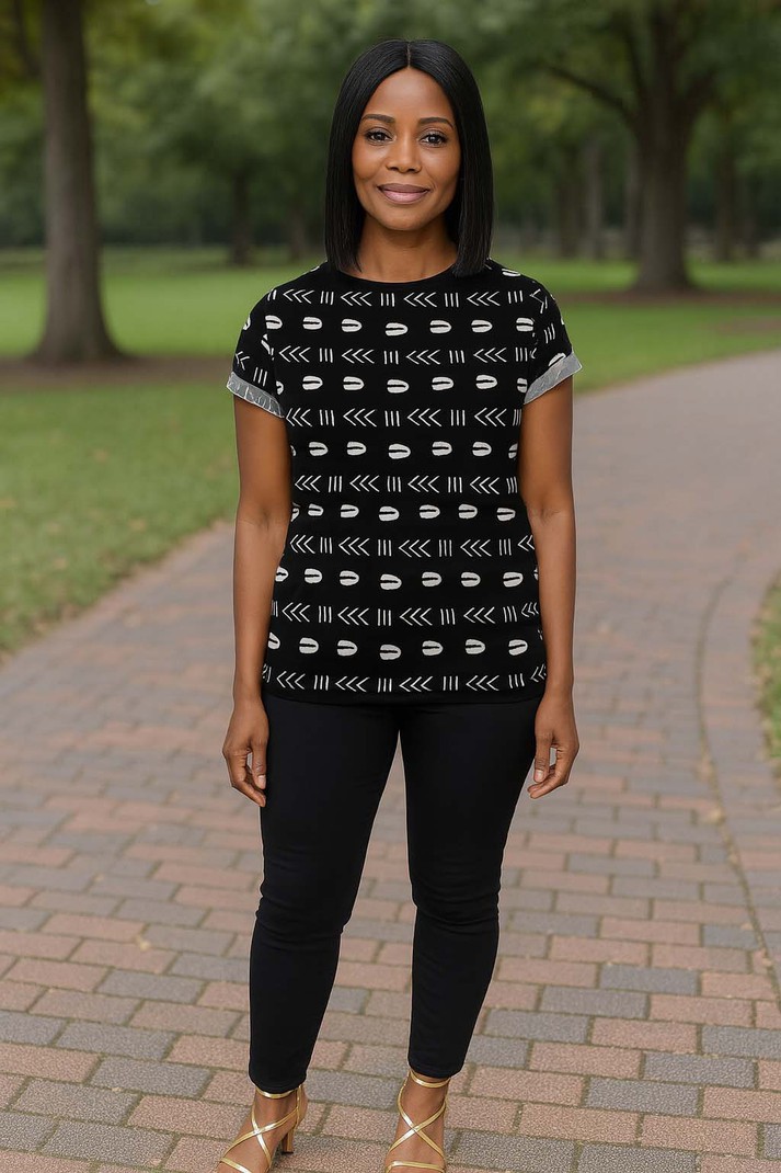 This Africa Cowrie Print Women T-shirt features a beautiful and unique cowrie print, inspired by traditional African designs. Made with high-quality materials, this t-shirt offers both comfort and style. Perfect for adding a touch of cultural flair to any outfit, this t-shirt is a must-have for any fashion-forward woman.