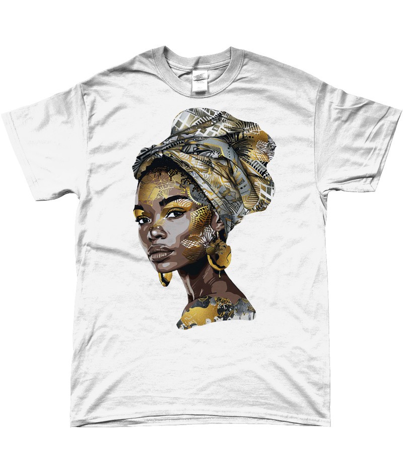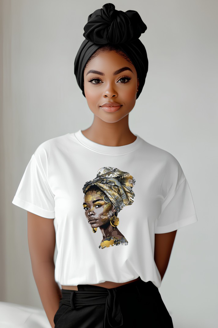 Turn heads with our effortlessly stylish white tee featuring a striking portrait of a woman crowned in a gold-adorned head wrap, a symbol of elegance, culture, and confidence. Designed for everyday wear, this shirt pairs softness with breathability, making it your go-to for warm days and relaxed outings. Whether you're dressing it up or keeping it casual, this tee lets you wear art, comfort, and empowerment in one bold look.