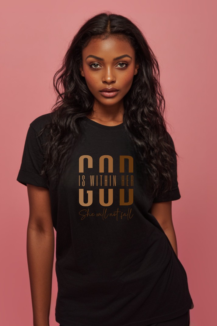 Find strength in style with our “God is Within Her” t-shirt. Made from soft, breathable fabric, this inspirational tee combines everyday comfort with a meaningful message of faith. The elegant design is a beautiful reminder of the divine power within, encouraging confidence, grace, and spiritual empowerment. Perfect for casual days, church gatherings, or gifting to a loved one, this shirt speaks volumes without saying a word. Uplift your wardrobe with purpose and style. Material: 100% ring-spun cotton Weight: 4.5 oz / y² (153 g / m²) Pre-shrunk for added durability Round collar Unisex or woman cut (your choice) Care Instructions: Machine wash cold inside out. Gentle cycle with mild detergent and like colors. Do not use bleach or fabric softener. Do not tumble dry. Hang to dry to ensure maximum shelf life. Iron inside out if necessary. Do not iron the print. Do not dry clean. Production: This product is made to order. The design is printed in one of our production centers (UK, EU, USA or Canada - depending on your delivery address).