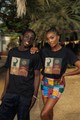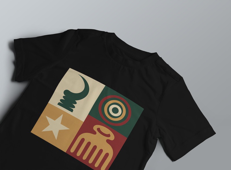Ce modèle graphique s’appuie sur une composition en blocs, mettant en valeur des icônes comme le peigne afro, le croissant royal ou la cible concentrique, dans une palette terreuse et solaire.