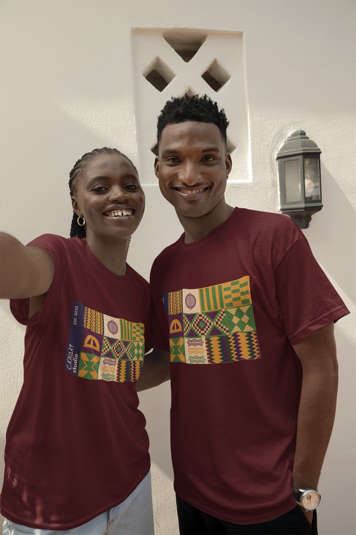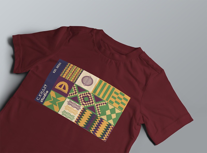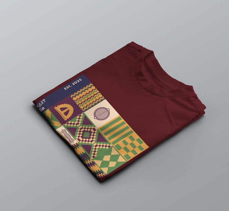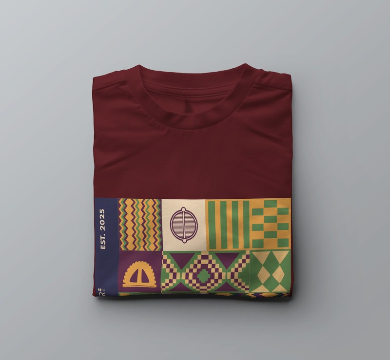 Entre motifs ancestraux et abstraction contemporaine, le t-shirt “Kenté 02” incarne une exploration vibrante du design graphique africain.