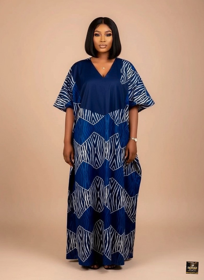 This captivating royal blue maxi Bubu dress is a stunning representation of modern ethnic fashion, meticulously crafted from premium Adire blend fabric that offers a luxurious sheen and a graceful, liquid-like drape. The gown features a sophisticated chevron-inspired pattern, where deep indigo tones meet striking white linear details in a rhythmic, diamond-grid layout that elongates the silhouette. A solid navy blue triangular panel at the chest provides a focal point of structured elegance, beautifully complementing the modest V-neckline and the relaxed, oversized sleeves that ensure maximum breathability and comfort. This exquisite piece is an impeccable choice for high-profile weddings, evening cocktail receptions, or festive holiday gatherings, striking the perfect balance between traditional artisanal heritage and high-end contemporary glamour.