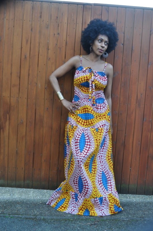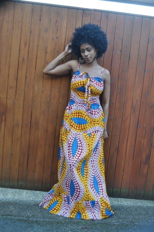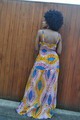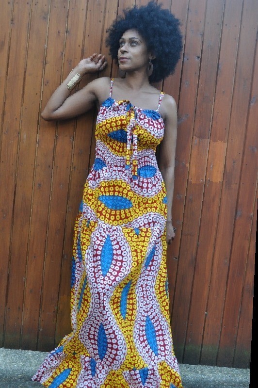 A maxi dress in an exquisite modernised African print with yellow and blues as the primary colours. There is an adjustable tie at the bust making the fit flexible. It has smocking at the waist giving a snug fit with a fluid bottom giving an elegant silhouette.