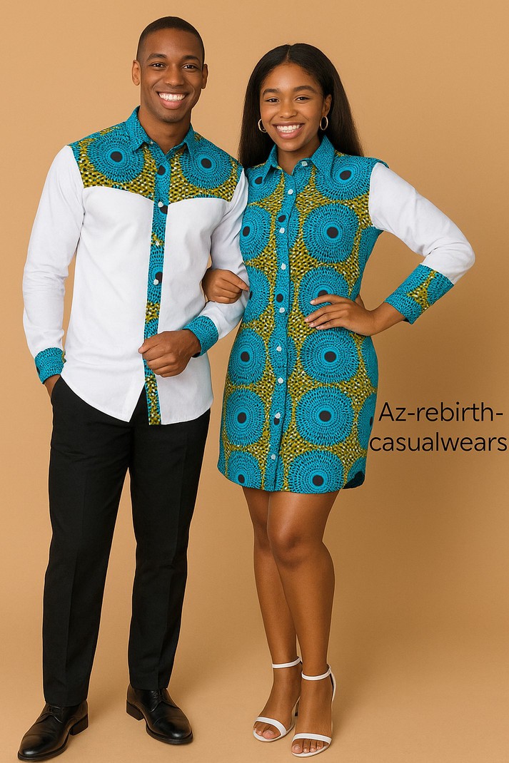 Stand out as a couple in this modern Ankara set. The men's shirt combines elegance and tradition with vibrant Ankara accents on a white base. The women's dress is a stylish shirt dress, comfortable and flattering, perfect for any occasion. This outfit is ideal for weddings, birthdays, parties, or special outings. Carefully handmade by Az-rebirth-casualwears. Available in all sizes.