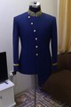 Découvrez notre tenue safari pour homme, confectionnée dans un tissu bleu marine de haute qualité, avec une coupe asymétrique élégante et des boutons dorés. Le col et les poignets sont sublimés par du tissu Ankara, apportant une touche africaine moderne et sophistiquée.