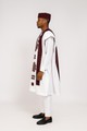 Découvrez cette élégante tenue traditionnelle pour homme, conçue dans un tissu blanc de qualité supérieure et magnifiquement ornée de broderies bordeaux. Ce design royal comprend une tunique longue avec des détails complexes, un pantalon assorti et une écharpe à motifs, accompagnés d’un chapeau traditionnel assorti.