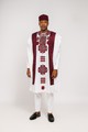 Elevate your style with this stunning traditional men's outfit, crafted from premium white fabric and adorned with intricate burgundy embroidery. The set features a long tunic with detailed patterns, matching trousers, a richly decorated stole, and a traditional cap.