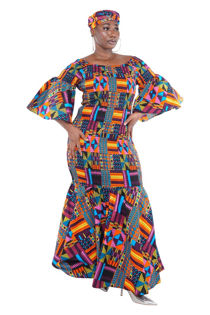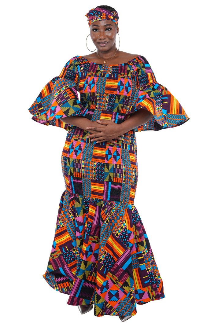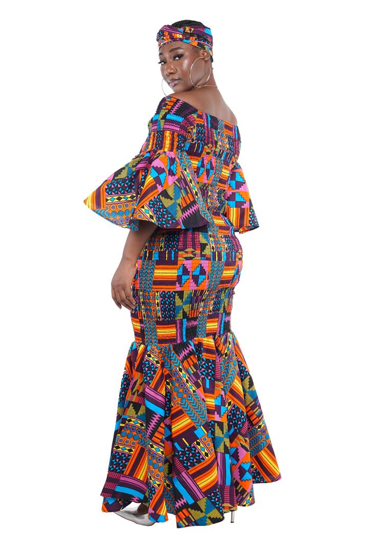 The African Long Smoked Mermaid/Fish Tail Dress a harmonious blend of traditional African aesthetics and contemporary elegance. Expertly crafted from 100% high quality cotton, this dress features a traditional Kente design with modern smocking techniques.