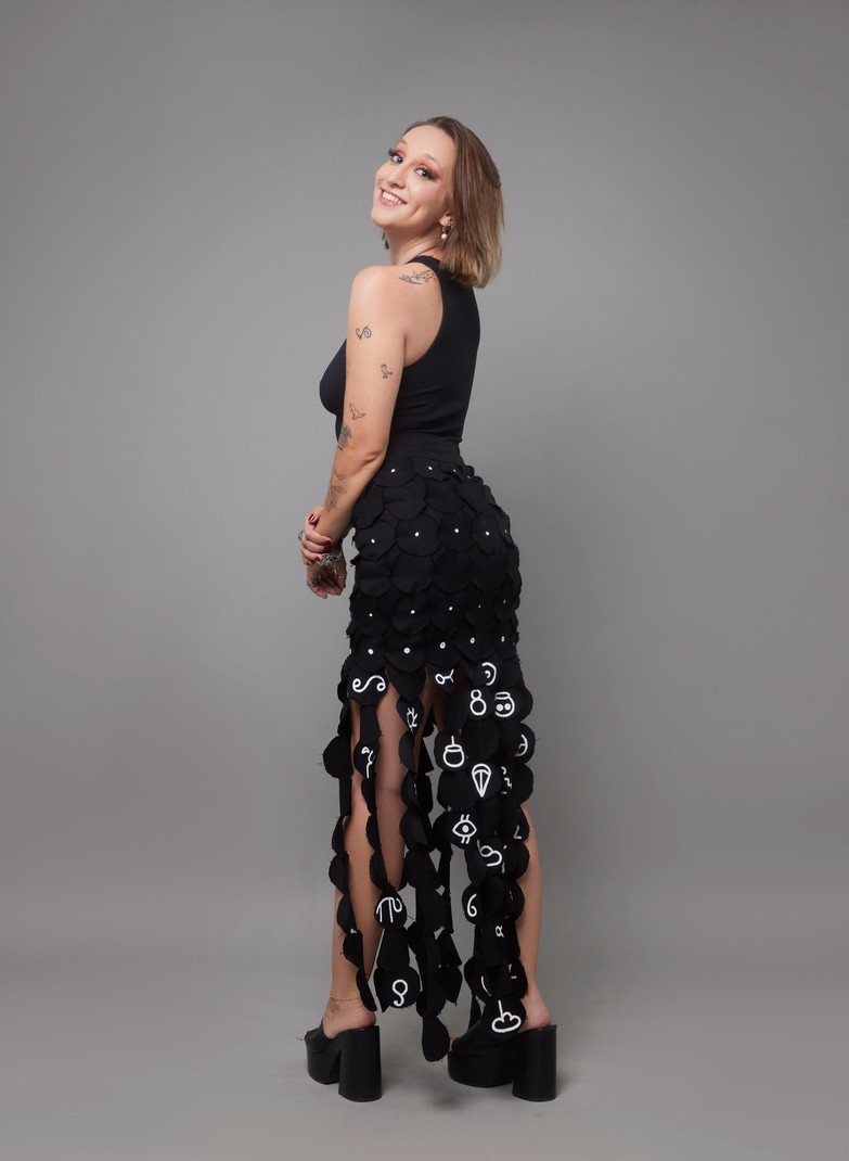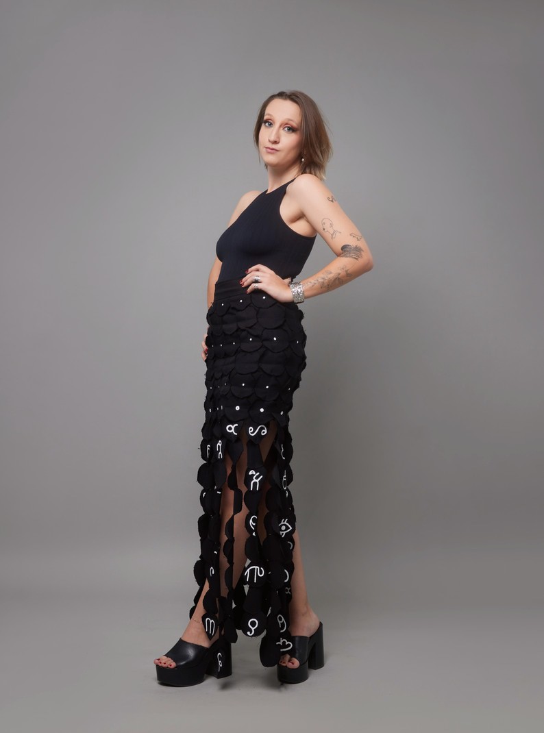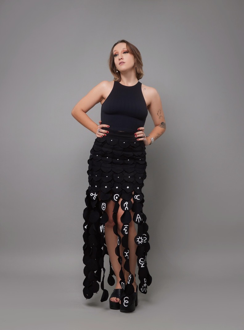 The Agile Skirt is a textile artwork inspired by nature and forgotten languages. Entirely made from an assemblage of layered, cut-out shapes, it evokes lush, living vegetation in constant motion. Each element is carefully embroidered and punctuated with hand-painted letters from the Bété alphabet, giving the piece a vibrant and symbolic dimension. Halfway between sculpture and garment, this skirt celebrates grounding and connection to the earth, while letting the lower panels flow and move freely with the body. It embodies a powerful, rooted femininity, in continuous dialogue with memory and gesture.