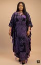 A dramatic and artistic black kaftan adorned with a geometric and figurative purple batik print reminiscent of traditional designs. This statement piece is detailed with deep purple tassels along the hemline and sleeves, enhancing its movement and flair.
