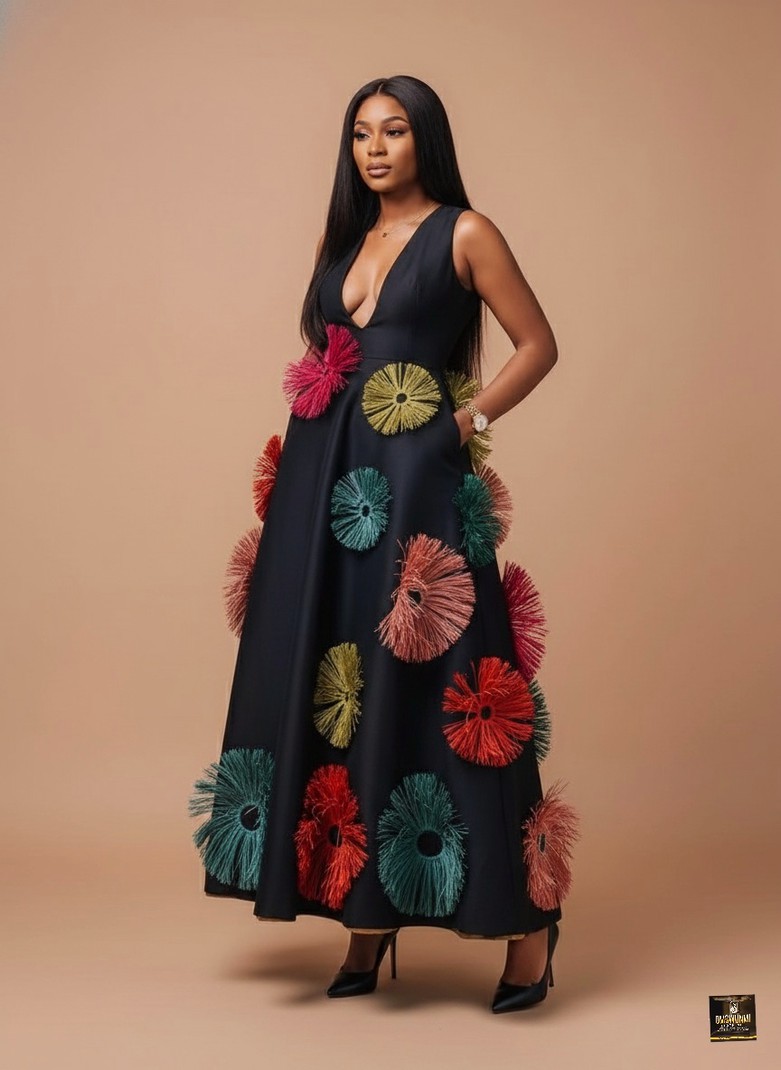The Carnival Bloom Tassel Maxi Dress is a wearable piece of art, combining a formal silhouette with festive, handcrafted details. This sophisticated black maxi gown features a clean, plunging V-neckline and a full, structured skirt that acts as a canvas for large, abstract circular appliqués. These "blooms" are formed from colorful, high-density fringed tassels in brilliant shades of red, pink, green, and yellow, scattered dynamically across the dress. This gown is an unforgettable choice for formal galas, black-tie optional events, or celebratory dinners where glamour is paramount.