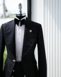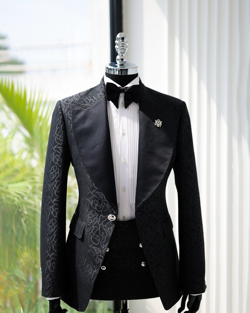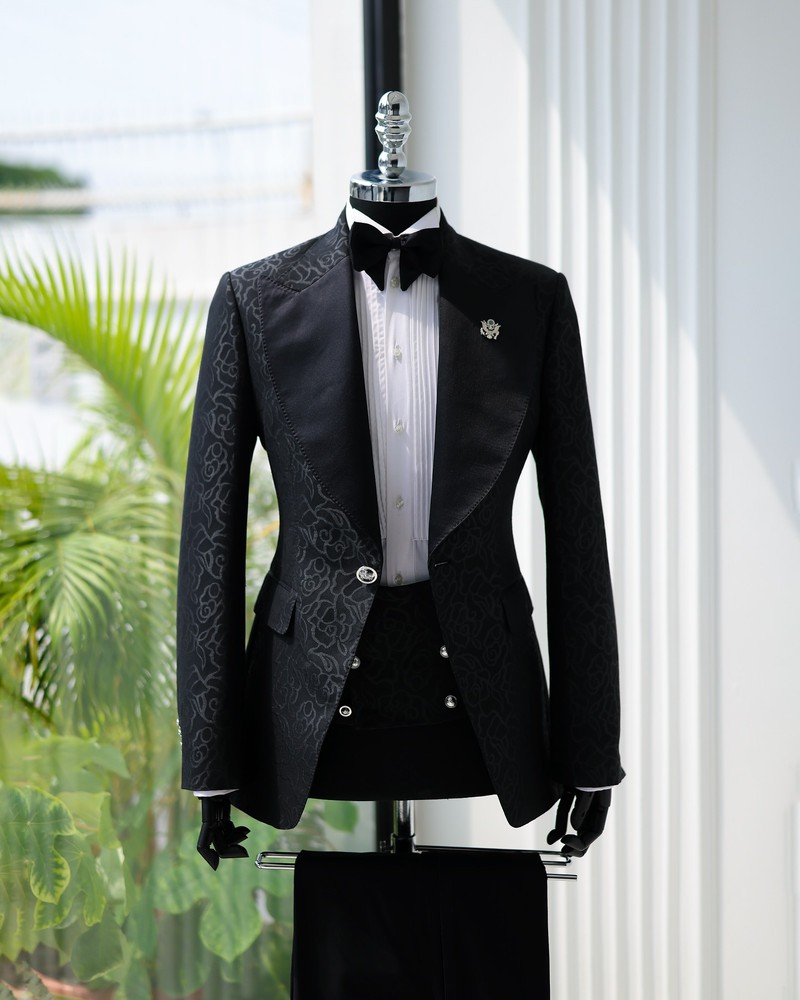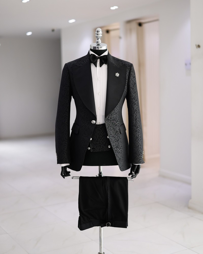A Charcoal Black, knitted floral jacquard, peak lapel with black silk tuxedo suit, double-breasted waistcoat, layered bow tie & pant trousers