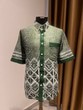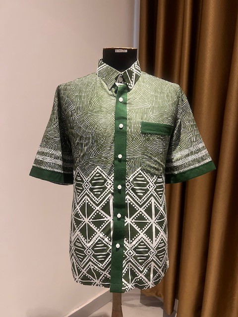 African print men’s shirt, Woodin short sleeve shirt, green and white tribal shirt, Ghanaian fashion brand, African cotton wear, Esmé Badu shirts, men’s cultural wear, bold African fashion, geometric print shirt, traditional meets modern shirt