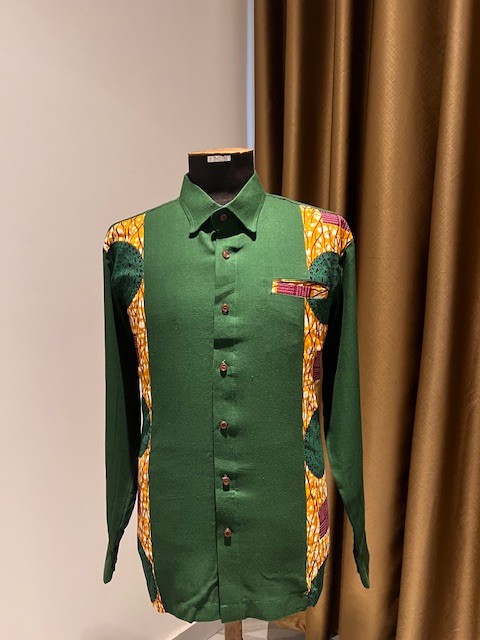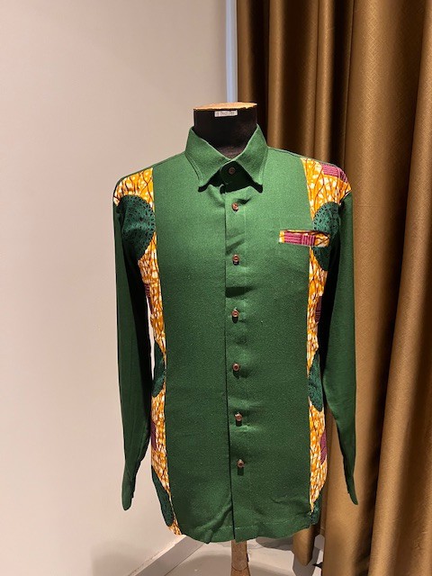 African men’s fashion, long-sleeve Ankara shirt, forest green linen shirt, African luxury wear, men’s traditional wear with modern twist, Ghanaian fashion brand, African print formal shirt, Esmé Badu menswear, heritage-inspired fashion, Father’s Day gift shirt