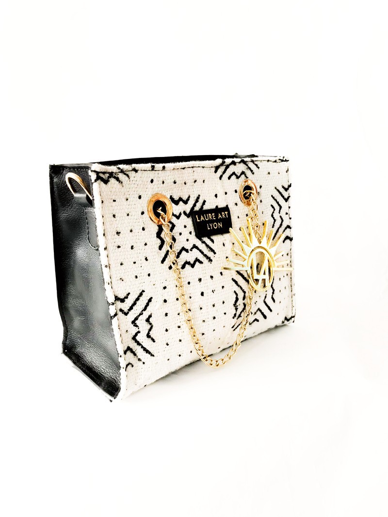 Signed by the Maison Laure Art, this small bag in black leather and African Bogolan fabric will seduce you with its elegance. With a handle, it can be worn on the shoulder for more mobility. Zipper inside pocket Calfskin Several colors available Measures: length 20cm width 9cm height 16cm OUR MANUFACTURING: Our captivating collection of handbags is an artisanal, authentic and traditional manufacture, entirely handmade in genuine leather, by passionate craftsmen. YOUR PAYMENT IS SECURE: By ordering LaureArt.com, your payment is 100% secure, your delivery is guaranteed, your item is up to standard, an after-sales service is at your disposal 7 days a week and you benefit from a 15 days as required by law. OUR GUARANTEE: Buying items online can be intimidating, so we want you to realize that there is absolutely no risk in buying from us and trying. If you don't like it, an exchange, a credit or a refund will be offered. NEED HELP ? If you need help, please contact us either by email or by phone on 0641827623