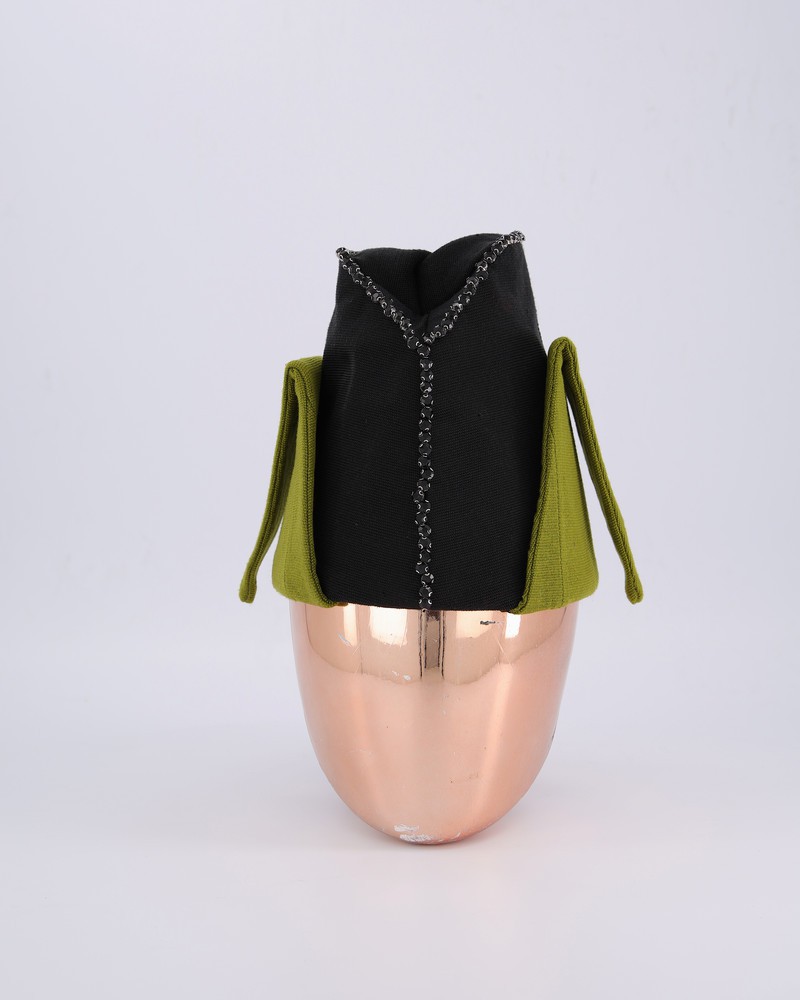 A Sacramento green velvet Yoruba hat mixed with Aso Oke and embellished with beading