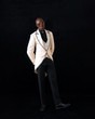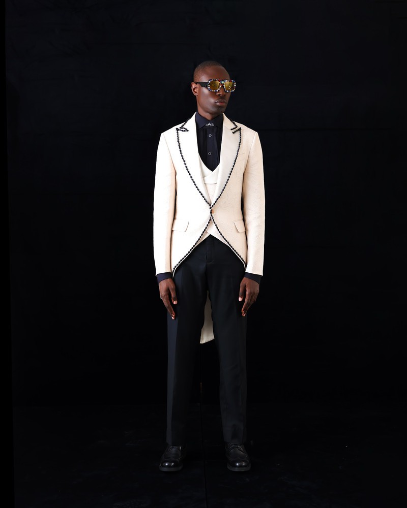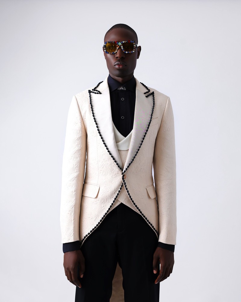 A cream, floral peak lapel tail tuxedo suit with black metallic beading details