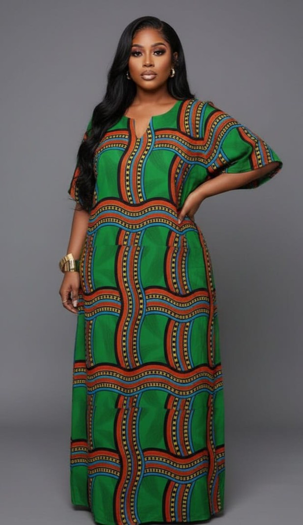 This Vibrant Emerald Wave-Print Kaftan is a celebration of bold color and flowing grace, meticulously tailored from high-quality, breathable cotton that ensures a soft touch and a structured, elegant drape. The garment features a striking green base adorned with a rhythmic, multi-colored wave pattern in orange, turquoise, and black, creating a dynamic visual flow that flatters the silhouette. Designed with a modest notched V-neckline and relaxed short sleeves, this floor-length gown offers a comfortable yet regal fit that transitions effortlessly from day to night. Its artistic print and breathable fabric make it an ideal choice for cultural festivals, sophisticated garden parties, or luxury resort wear. Whether you are attending a celebratory brunch or a relaxed evening social, this kaftan provides a perfect blend of modern style and traditional inspiration for an unforgettable presence.
