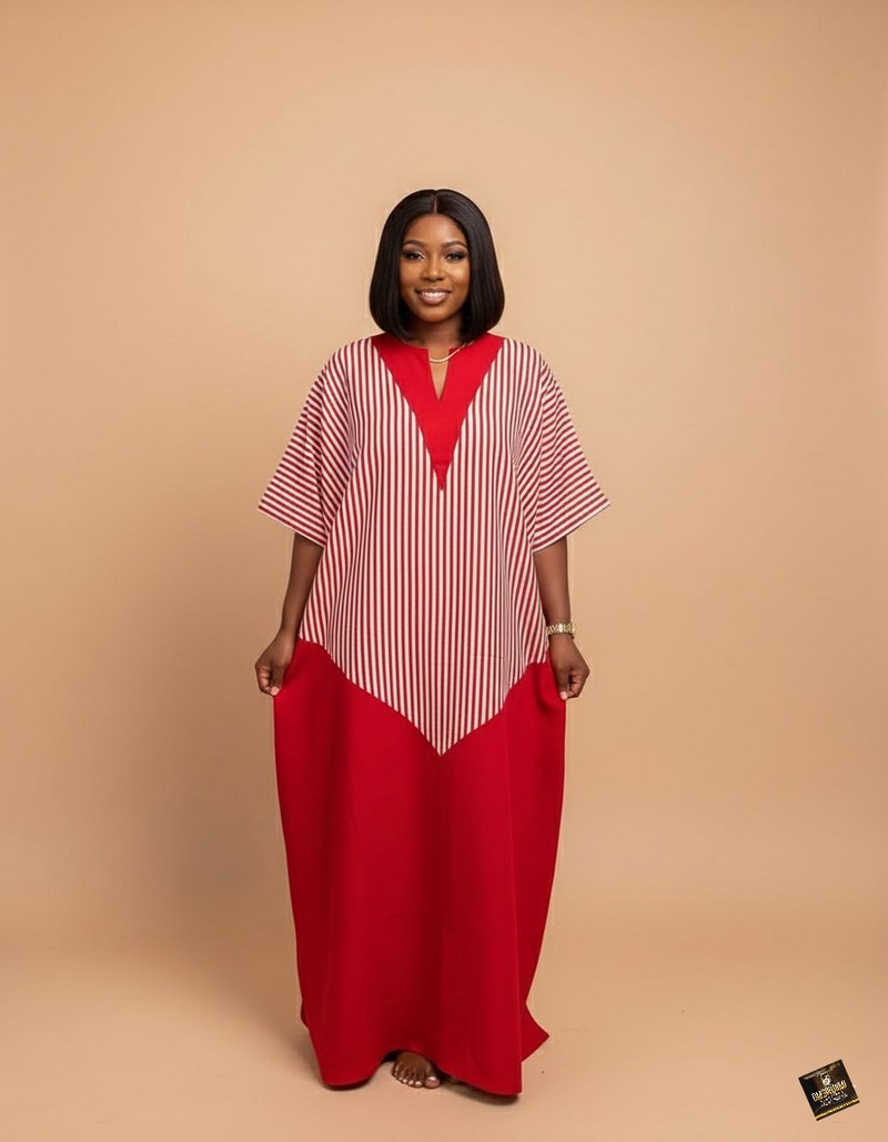 This eye-catching floor-length kaftan is a masterpiece of contemporary artisanal design, featuring a striking dual-textured aesthetic that pairs fine red and white vertical pinstripes with a solid, vibrant red lower panel. Meticulously crafted from premium, high-quality polished cotton, the fabric provides a structured yet breathable drape that ensures a regal silhouette and all-day comfort. The gown is defined by a bold red V-neckline that perfectly anchors the geometric chevron transition between the striped bodice and the solid skirt, creating a flattering and modern visual flow. This versatile piece is an ideal choice for high-profile cultural celebrations, upscale garden parties, or as a distinguished ensemble for formal holiday gatherings where you want to radiate effortless grace and bold style.