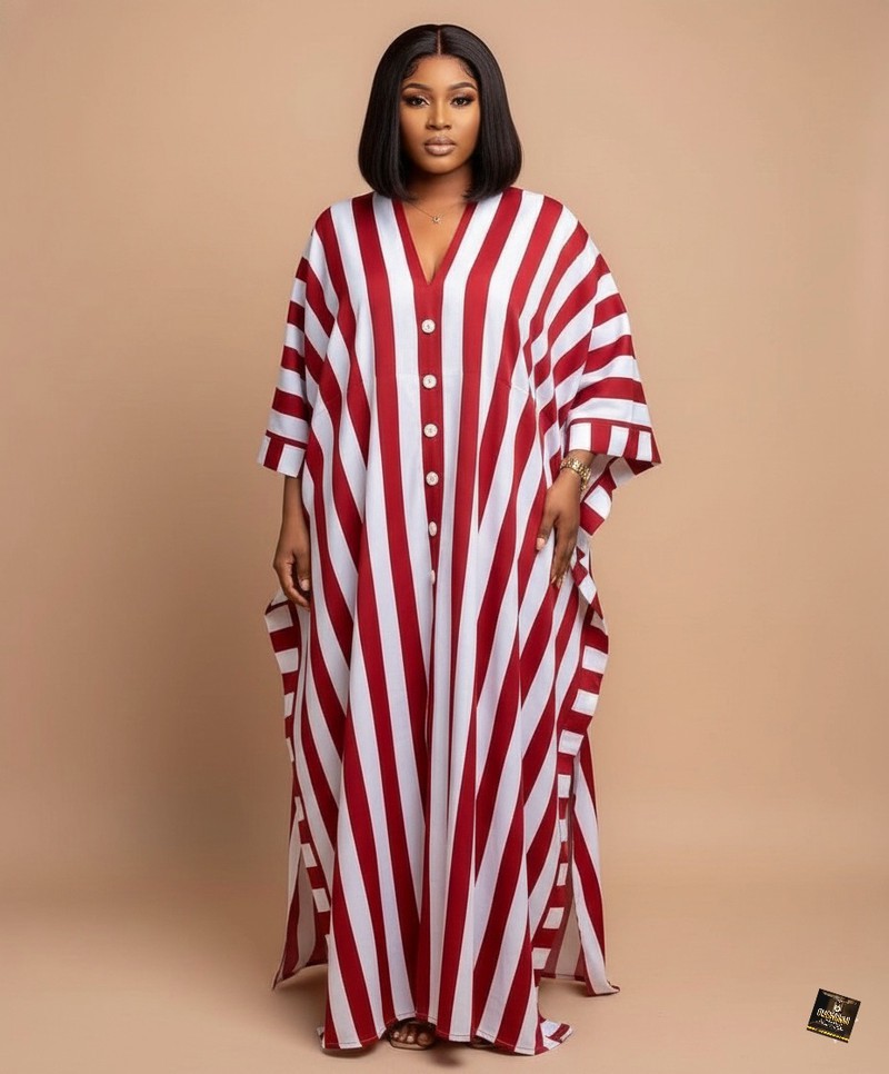 This vibrant floor-length kaftan is a striking example of contemporary artisanal fashion, featuring a bold, wide-striped design in a classic combination of deep red and crisp white. Expertly tailored from premium, high-quality polished cotton, the fabric provides a smooth, breathable feel and a structured yet flowing drape that ensures a regal and voluminous silhouette. The gown is distinguished by a deep V-neckline and a full-length button-down front, accented by oversized sleeves and elegant side slits that allow for graceful movement. Perfectly complemented by a sophisticated gold chain wristwatch, this majestic piece is an ideal choice for high-profile cultural festivals, upscale tropical resort dinners, or as a statement ensemble for formal holiday celebrations where you want to radiate effortless confidence and grace.