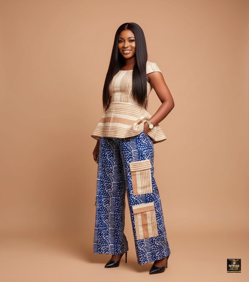 The trousers are bold wide-leg pants in a deep blue and white Batik print. They feature large, contrasting patch pockets made from the same woven striped fabric as the top, offering a chic, utilitarian flair.