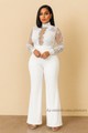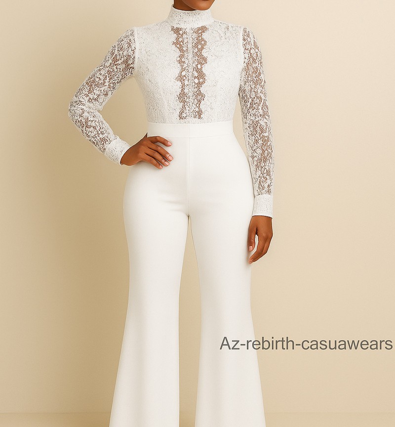 This stunning outfit is a two-piece set designed to give the illusion of a jumpsuit when worn. It features a luxurious long-sleeve lace top with intricate floral detailing, a high neck, and a delicate sheer panel at the front for a touch of sophistication. The matching high-waist tailored pants elongate the legs and create a sleek, streamlined silhouette. Perfect for weddings, formal events, or special occasions, this set offers elegance, comfort, and versatility in one look.