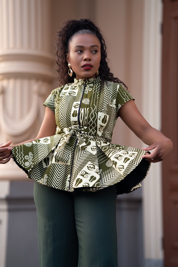 The crisp and well-defined peplum on this top make a stunner that will serve you every time. It has a front zipper and belt which helps to provide a perfect waistline fit. The geometric fabric design is simply beautiful.