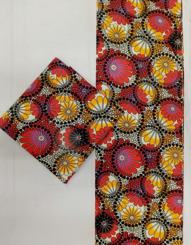 This lively floral medallion print bursts with warm tones of red, orange, yellow, and pink layered over intricate black dot detailing. The circular flower clusters create a bold, artistic texture that looks stunning in fashion and décor projects. Lightweight, durable, and beautifully vibrant — perfect for flowy dresses, kaftans, tops, wraps, curtains, and accessories.