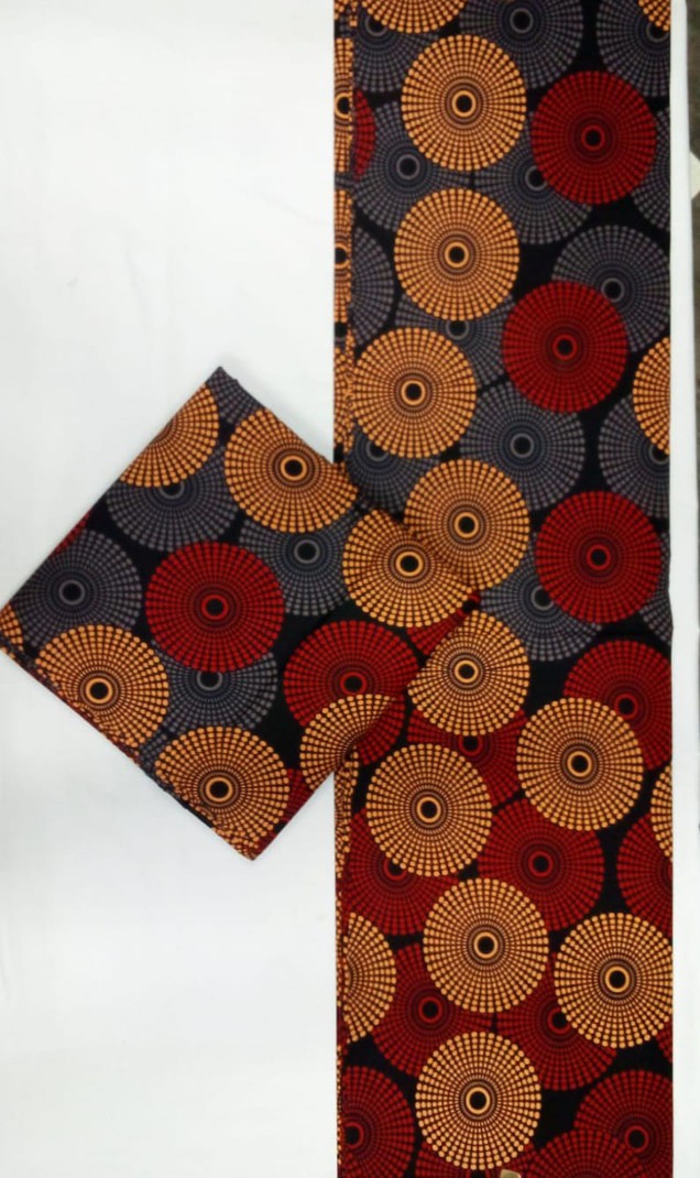This premium African print fabric features a striking circular motif in warm tones of gold, amber, and deep red against a rich dark background. Each concentric pattern radiates with precision, giving the fabric a modern geometric feel while staying true to classic African design aesthetics.