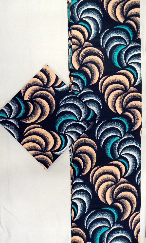 This elegant print features sweeping crescent motifs in soft beige, cool white, and vibrant teal on a deep navy background, creating a modern, wave-inspired pattern that feels both bold and refined; crafted from high-quality cotton, it offers a smooth, breathable finish perfect for dresses, shirts, skirts, or custom design pieces that call for effortless style with a touch of artistic flair.