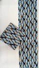 Bring movement and elegance to your creations with this flowing wave-print cotton fabric, featuring intertwining blue, mustard, and white curves on a deep navy base for a modern, dynamic look perfect for dresses, shirts, decor, or standout custom pieces.