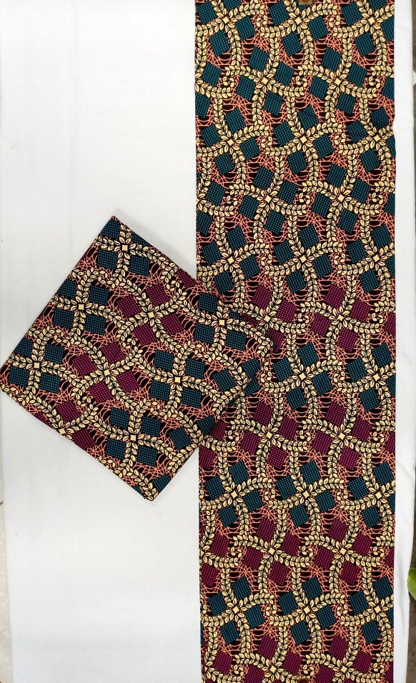 This Ankara print features an intricate interlocking pattern in rich burgundy, deep teal, and warm golden tones, creating a bold yet elegant geometric flow. Its vibrant colour harmony and detailed motifs make it perfect for standout fashion pieces, accessories, or décor that demand both cultural flair and modern sophistication.