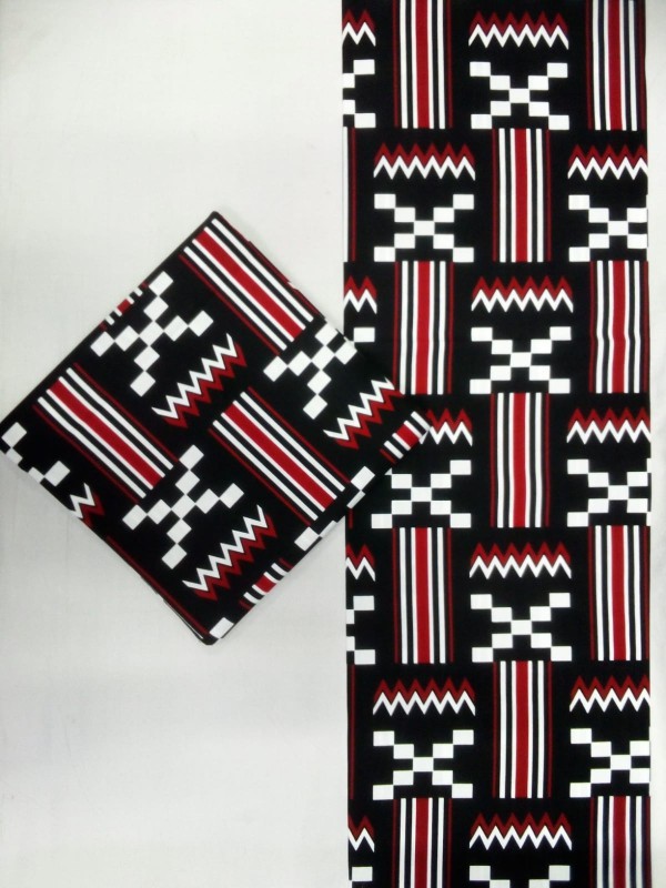 This bold African print fabric features a striking black base enhanced with sharp white geometric motifs and vibrant red accents, creating a powerful, structured pattern perfect for fashion-forward looks. Its balanced mix of stripes, zigzags, and block shapes adds depth and movement, making it ideal for statement outfits, accessories, or decor pieces. Crafted from high-quality cotton, it offers comfort, durability, and standout style for any creative project.