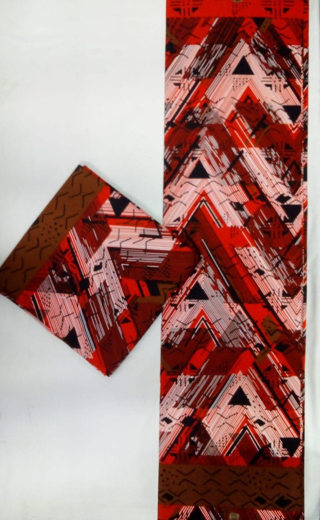 Bold and dynamic, this red geometric print fabric features striking layered chevrons, sharp linework, and contemporary abstract accents that create a powerful visual statement. The rich blend of deep reds, earthy browns, and black detailing gives it a modern edge, making it perfect for standout outfits, accessories, or décor pieces. Crafted from quality, soft-textured material, it offers both comfort and durability—ideal for anyone looking to bring vibrant energy and artistic flair to their wardrobe or creative projects.