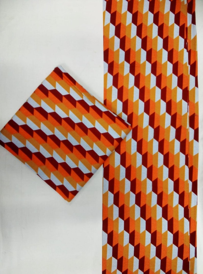 This vibrant 6-yard cotton fabric stacks bold geometric blocks in fiery orange, deep red, and crisp white, creating a rhythmic, three-dimensional pattern that feels both modern and energizing. Its clean, structured design makes it perfect for sharp shirts, standout dresses, coordinated sets, or décor pieces that call for colour, confidence, and a touch of playful sophistication.