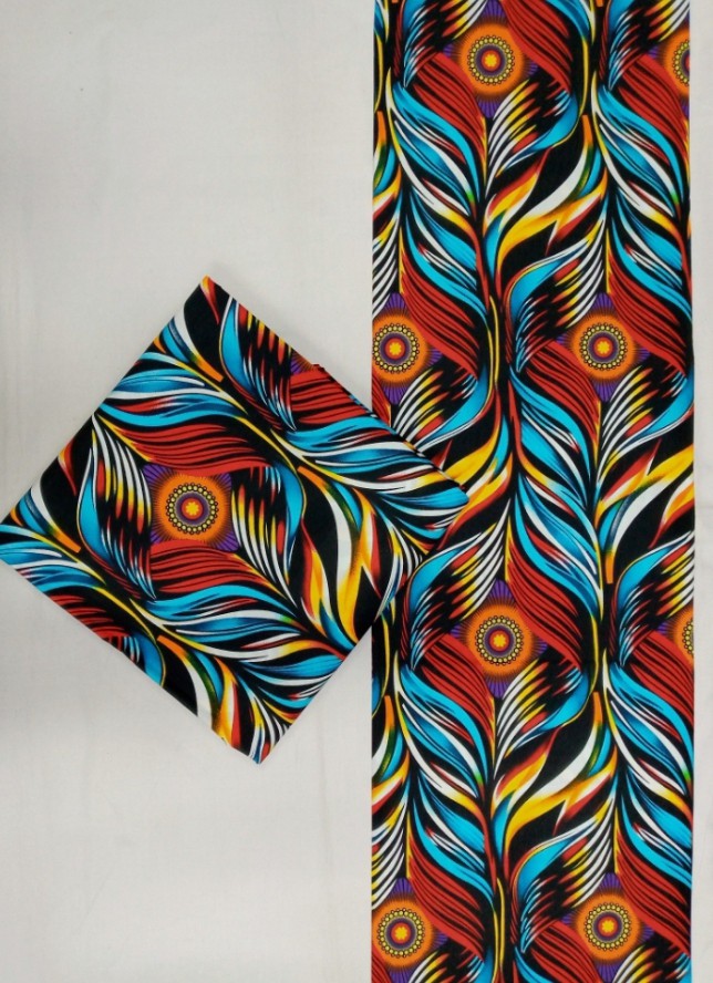 This 6-yard cotton fabric erupts in a carnival of colour—fiery reds, electric blues, sunlit yellows, and inky blacks—woven into bold, feather-like strokes that ripple with movement. At the centre of each plume sits a radiant circular motif, glowing like a tiny festival lantern. Vibrant, dramatic, and brimming with energy, it’s perfect for standout pieces that celebrate confidence and flair.