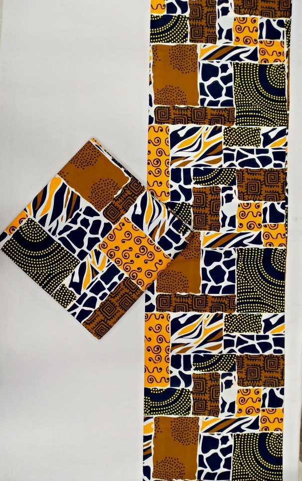 A mosaic of bold personality, this fabric stitches together a chorus of patterns—giraffe-like spots, spiralling swirls, dotted crescents, and flowing strokes—each patch humming its own melody. The warm ochre tones meet deep navy and crisp white, creating a lively patchwork that feels both artistic and adventurous. Perfect for outfits that want to tell a story in every square.
