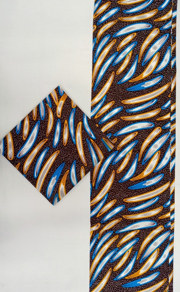 Feather-like strokes in blue, gold, and white sweep across a rich chocolate backdrop, creating a lively pattern that feels airy, bright, and full of motion. Each elongated shape glides like a brush dipped in sunlight and sky, giving the fabric an uplifting, free-flowing elegance.