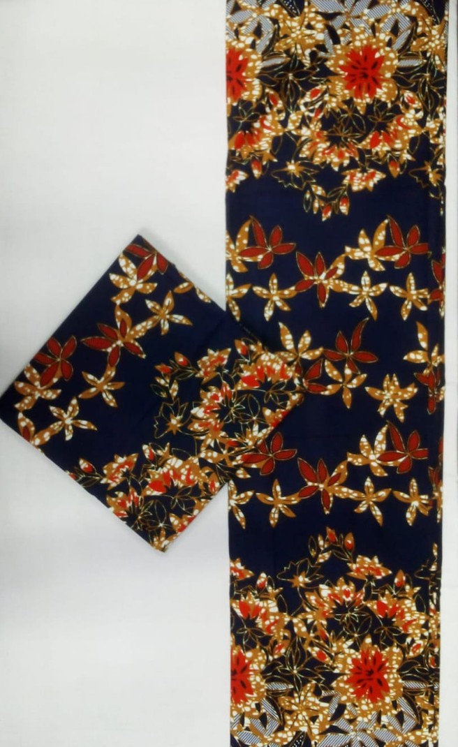 Golden petals, caramel florals, and warm red blooms scatter across a navy field, creating a rich and romantic textile. Each motif glows as if dusted with warm light, bringing elegance to everyday wear or special pieces.