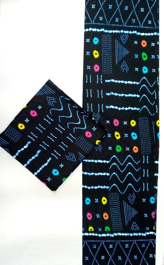 A deep black base decorated with sky-blue mudcloth markings and playful multicolour dots. Modern, artsy and perfect for expressive styling.