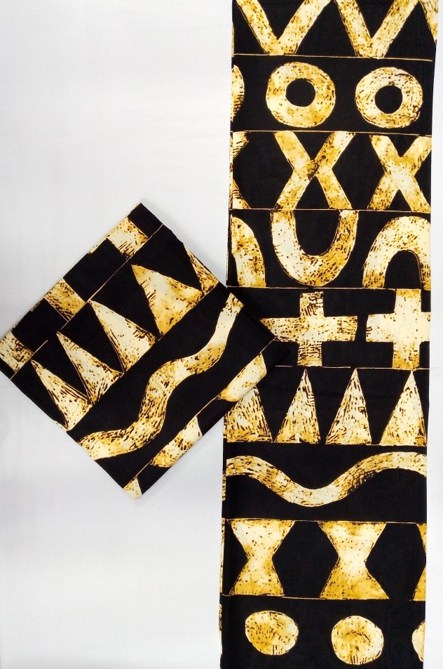 A bold mudcloth-inspired beauty featuring golden geometric strokes on a deep black canvas. The mix of Xs, triangles, circles and wavy lines creates a striking, hand-painted aesthetic that feels earthy yet modern. Perfect for statement outfits, décor accents or creative fashion projects.