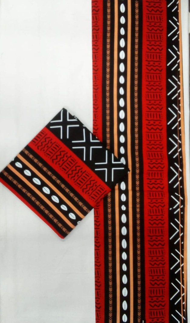 Bold red, tan, and black stripes enriched with cultural motifs and cowrie-inspired accents. A striking, heritage-rooted design that commands attention.