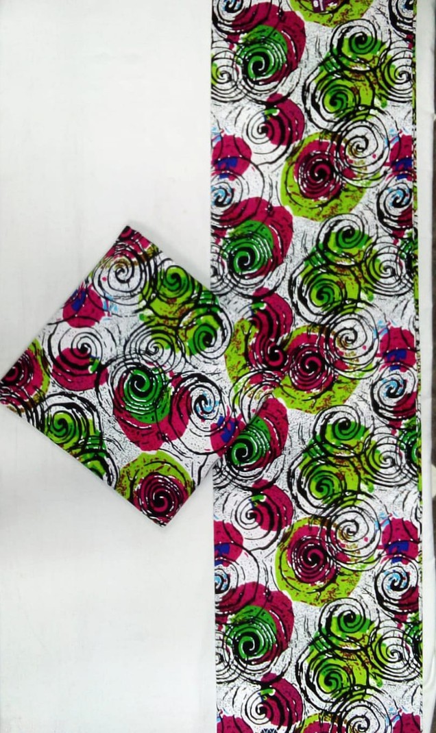 A lively swirl print bursting with electric green, magenta, and splashes of cobalt, all spinning over a textured white base. Layered spiral lines add movement and depth, creating a playful yet modern look that stands out effortlessly. Perfect for bold, creative styling that demands attention.