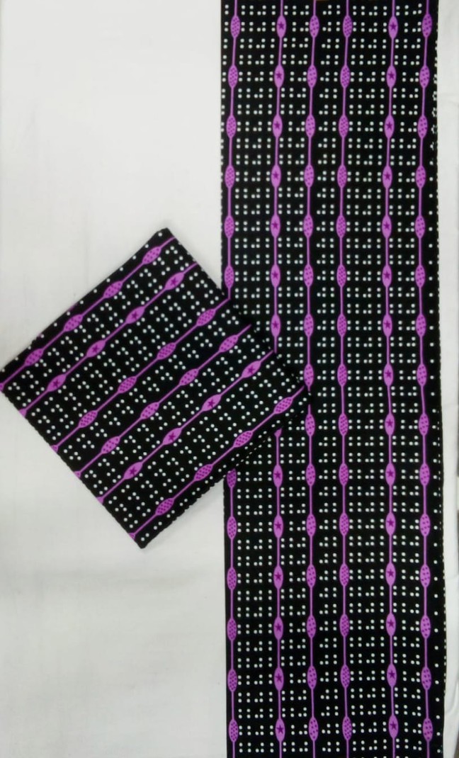 A sleek black cotton fabric accented with crisp white dots and vertical violet symbol lines, creating a clean, rhythmic, architectural pattern. Minimalist yet expressive, this print brings refined style to dresses, shirts, tunics and polished accessories with its smooth finish and easy-to-sew structure.