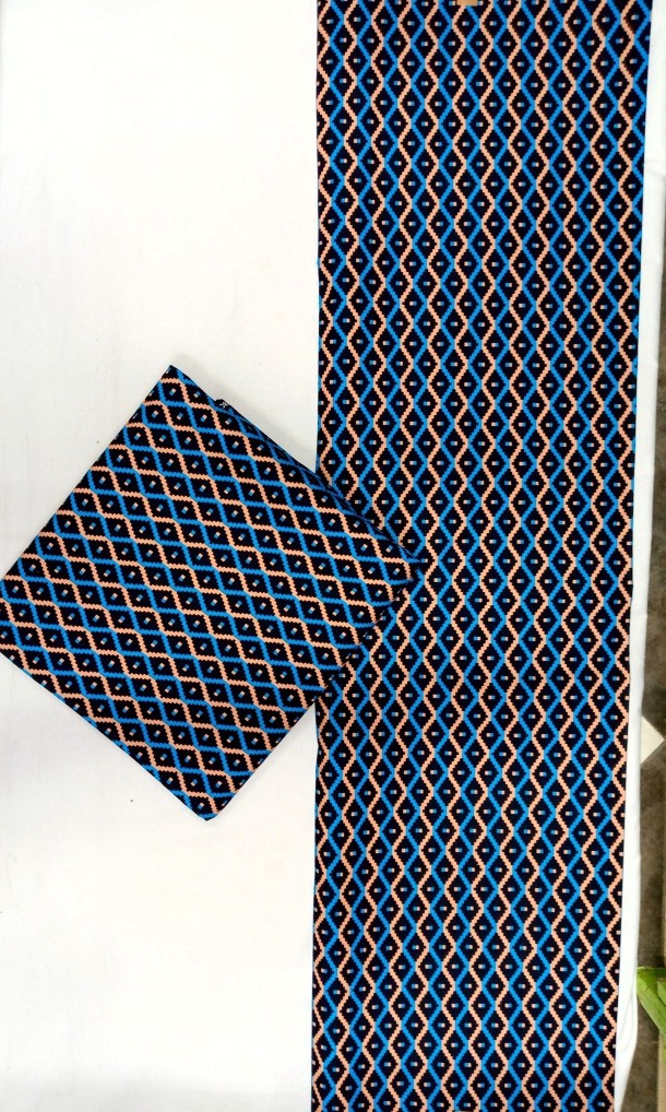 Deep navy hosts a clean lattice of small blue and tan diamonds, forming a crisp, repeating pattern that’s both classic and contemporary. The tight design brings easy elegance to shirts, dresses, crafts, and refined decor essentials.