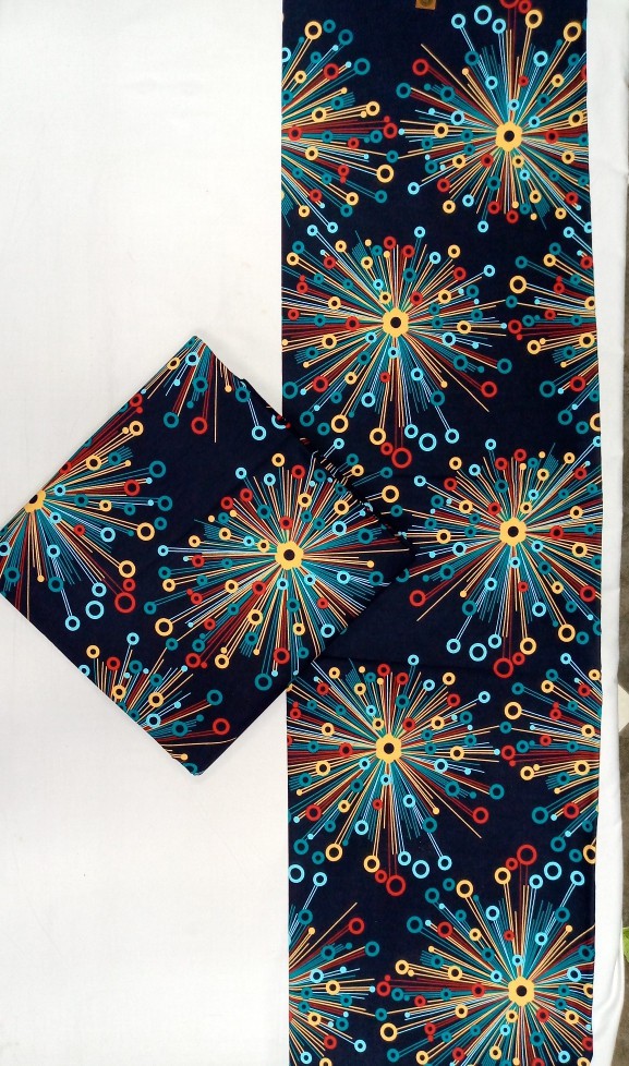 A lively navy cotton print exploding with radiant firework motifs in yellow, teal, red and sky-blue, each burst detailed with fine linear spokes and playful rings. Bold, modern and full of movement, it’s a standout fabric that brings instant brightness to any wardrobe or creative project.