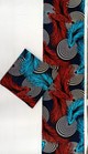 A luxurious cotton print blending sweeping feather shapes in electric blue and deep red with dotted circular accents. Dramatic, fluid and visually captivating, it adds instant flair to garments, accessories or unique décor creations.