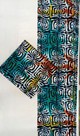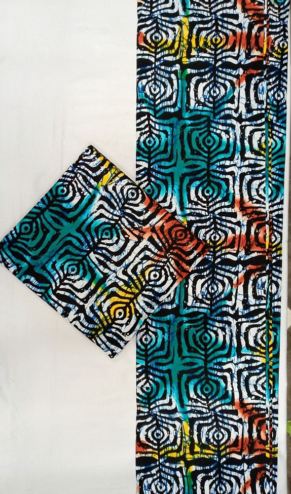 A vibrant multicoloured stamp-pattern batik featuring teal, yellow, orange, and black detailing, creating a layered geometric rhythm ideal for expressive, artistic fashion statements.