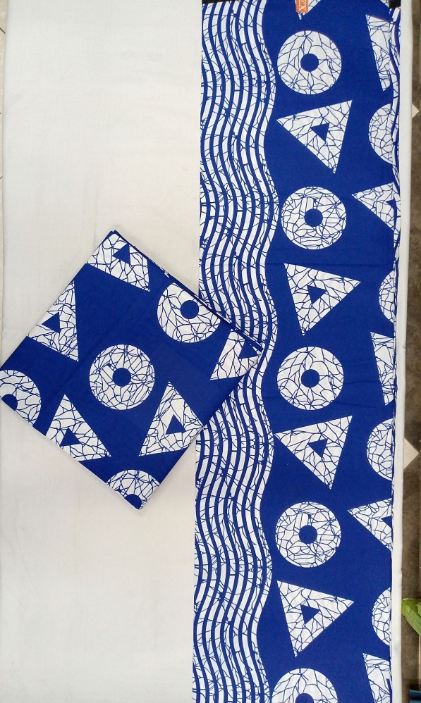 A crisp blue-and-white African print featuring circular cracked-shell motifs and bold triangular shapes. Wavy vertical lines add movement, giving the pattern a clean and refreshing coastal feel.