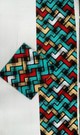 A colourful maze-style print combining teal, mustard, red, white, and black in interlocking zigzag pathways. The layered textures and bright palette create a lively, playful geometric design.